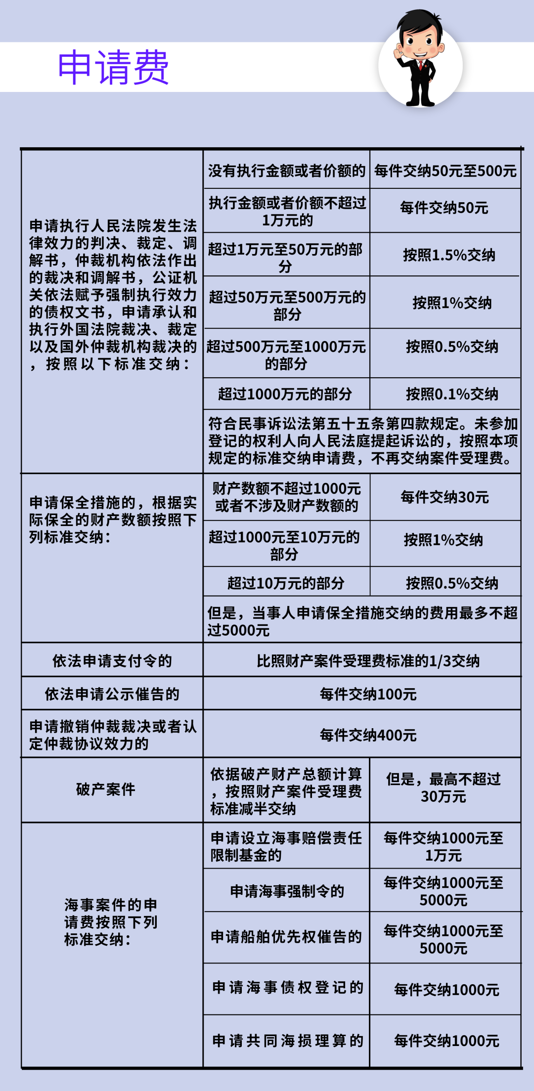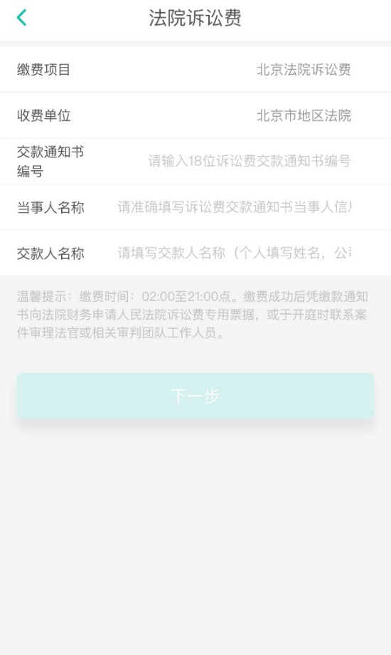 一 诉讼费用有哪些种类? 1 案件受理费 案件受理费是绝大部分案件都需缴纳的费用,主要包括一审、二审以及再审案件中按规定应缴纳的费用。案件受理费的收取标准分为财产案件和其他种类案件。 财产案件,诉讼标的不超过1万元的,每件缴纳50元;诉讼标的超过1万元的,根据不同标的区间,按照费用比例递减的原则收取0.5%-2.5%的案件受理费。 案件受理费的收费标准详见下图 审判监督程序(即再审程序)审理的案件,当事人不交纳案件受理费。但是,下列情形除外: ①当事人有新的证据,足以推翻原判决、裁定,向人民法院申请再审,人民法院经审查决定再审的案件; ②当事人对人民法院第一审判决或者裁定未提出上诉,第一审判决、裁定或者调解书发生法律效力后又申请再审,人民法院经审查决定再审的案件。 另外,还有四种案件不需要交纳案件受理费,分别是: ①依照《民事诉讼法》规定的特别程序审理的案件; ②裁定不予受理、驳回起诉、驳回上诉的案件; ③对不予受理、驳回起诉和管辖权异议裁定不服,提起上诉的案件; ④行政赔偿案件。 2 申请费 申请费是指当事人依法向人民法院申请相应事项时应缴纳的费用。具体申请事项与收费标准见下图。 // 申请事项与收费标准 3 其他费用 证人、鉴定人、翻译人员、理算人员在人民法院指定日期出庭发生的交通费、住宿费、生活费和误工补贴。此类费用由人民法院按照国家规定标准代为收取。 二 除了案件受理费 在诉讼过程中还可能产生哪些费用? 诉讼过程中因鉴定、公告、勘验、翻译、评估、拍卖、变卖、仓储、保管、运输、船舶监管等发生的依法应当由当事人负担的费用,人民法院根据谁主张、谁负担的原则,由当事人直接支付给有关机构或者单位。 人民法院依照《民事诉讼法》第十一条第三款规定,提供当地民族通用语言、文字翻译的,不收取费用。 温馨提示 上述费用是直接给付给有关机构或者单位的,因此提示您核实收费单位身份资质,并向有关单位索要正规发票。例如:申请鉴定的案件中,申请人应向鉴定机构索要鉴定费发票。 三 诉讼费用的预交? 诉讼费用依照规定由相应当事人预交,具体如下: 01 案件受理费 ①一审本诉:原告预交 ②一审反诉:被告预交 ③二审:上诉人预交,双方当事人都提起上诉的,分别预交。 ④再审(依照规定需要缴纳受理费的):申请人预交,双方当事人都申请再审的,分别预交。 ⑤有独立请求权的第三人参与诉讼:有独立请求权的第三人预交。 ⑥追索劳动报酬的案件:可以不预交。 02 申请费 ①原则上由申请人预交 ②例外情形:执行申请费和破产申请费不由申请人预交,执行申请费执行后交纳,破产申请费清算后交纳。 03 证人、鉴定人等费用 证人、鉴定人、翻译人员、理算人员在人民法院指定日期出庭发生的交通费、住宿费、生活费和误工补贴:待实际发生后交纳。原则上由申请人预交,具体的费用负担需要根据案件的实际情况确定。 04 增加或减少诉讼请求 ①当事人增加诉讼请求数额的,按照增加后的诉讼请求数额计算补交; ②当事人在法庭调查终结前提出减少诉讼请求数额的,按照减少后的诉讼请求数额计算退还。 一般来说,当事人应该在收到法院发给当事人的诉讼费交款通知书之日起七日内缴费,逾期不交的,要承担相应法律后果。 四 不交诉讼费会产生哪些法律后果? 当事人逾期不交纳诉讼费用又未提出缓交、减交或者免交诉讼费用司法救助申请的,或者司法救助未获批准,在人民法院指定期限内仍未交纳诉讼费用的,由人民法院依照有关规定处理: ● 原告未按期交纳案件受理费的,按照撤回起诉处理; ● 反诉人未按期交纳案件受理费的,按照撤回反诉处理; ● 上诉人未按期交纳案件受理费的,按照撤回上诉处理; ● 申请人未按期交纳申请费,经法院催促仍不交纳的,一般按照撤回申请处理; ● 其他费用将由法院按照“谁主张、谁负担”原则决定负担人员。不履行缴纳义务的,可能会发生相关程序终止的法律后果。例如,没有按期向鉴定机构缴纳鉴定费的,鉴定程序将会被终止。 需要注意的是,预交的诉讼费可能并非由预交的当事人承担,在案件审理结束后,法院会对诉讼费用的负担作出判定,并由最终承担方承担。 五 如何缴纳诉讼费? 需要缴费时,法院将向缴费人开具诉讼费交款通知书。一般来说,在北京法院缴纳诉讼费有两个途径。一是通过线下缴纳,即携带诉讼费交款通知书前往法院指定窗口或者指定银行缴纳诉讼费,并前往法院指定窗口换取缴费收据;二是通过线上缴纳。如疫情防控期间,为便利当事人,法院开通了微信缴费的方式缴纳诉讼费用。 线上缴纳诉讼费 第一步 通过微信“扫一扫”扫描左下角缴费二维码。 // 诉讼费交款通知书 第二步 在出现的“法院诉讼费”页面输入通知书右上方18位缴费码,以及当事人、交款人的名称(仅填写交费方当事人名称即可)。 // "法院诉讼费"页面 第三步 填写完成,生成付款页面,进行微信缴费。 六、 生活困难 我可以申请减免诉讼费吗? 按照相关规定,如果当事人交纳诉讼费用确有困难的,可以向人民法院申请缓交、减交或者免交诉讼费用的司法救助。具体的情形分为免交、减交和缓交三种: 01 免交诉讼费的情形: 1 残疾人无固定生活来源的; 2 追索赡养费、扶养费、抚育费、抚恤金的; 3 最低生活保障对象、农村